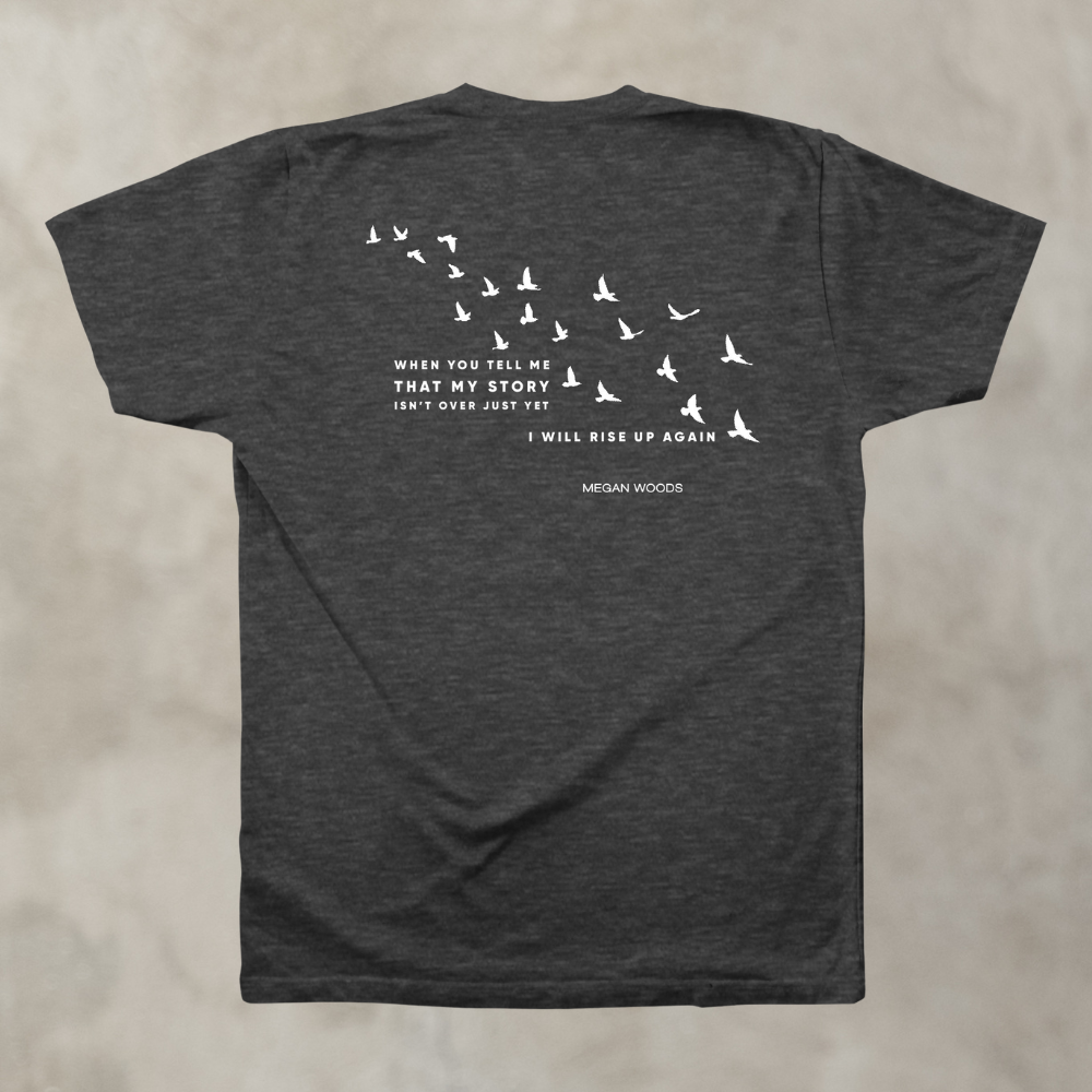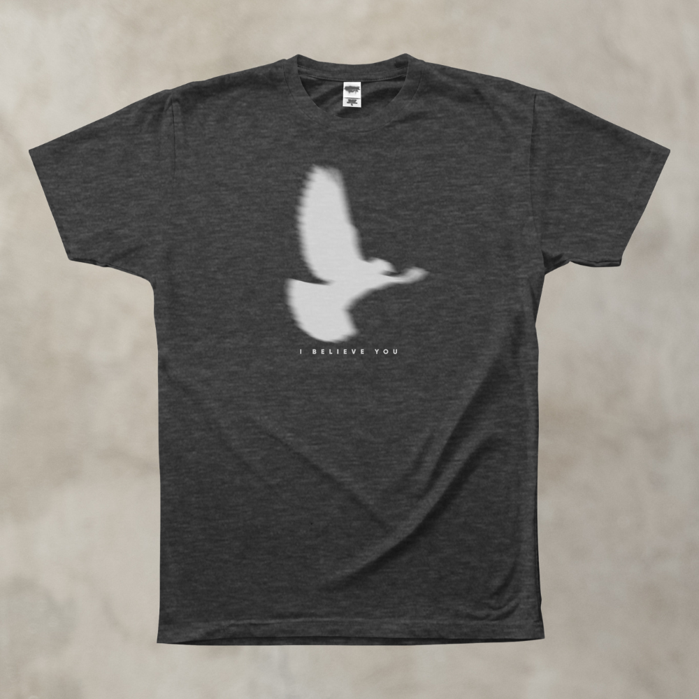 Dark heather grey tee featuring "I Believe You." 100% cotton.